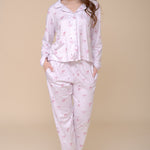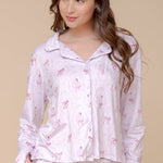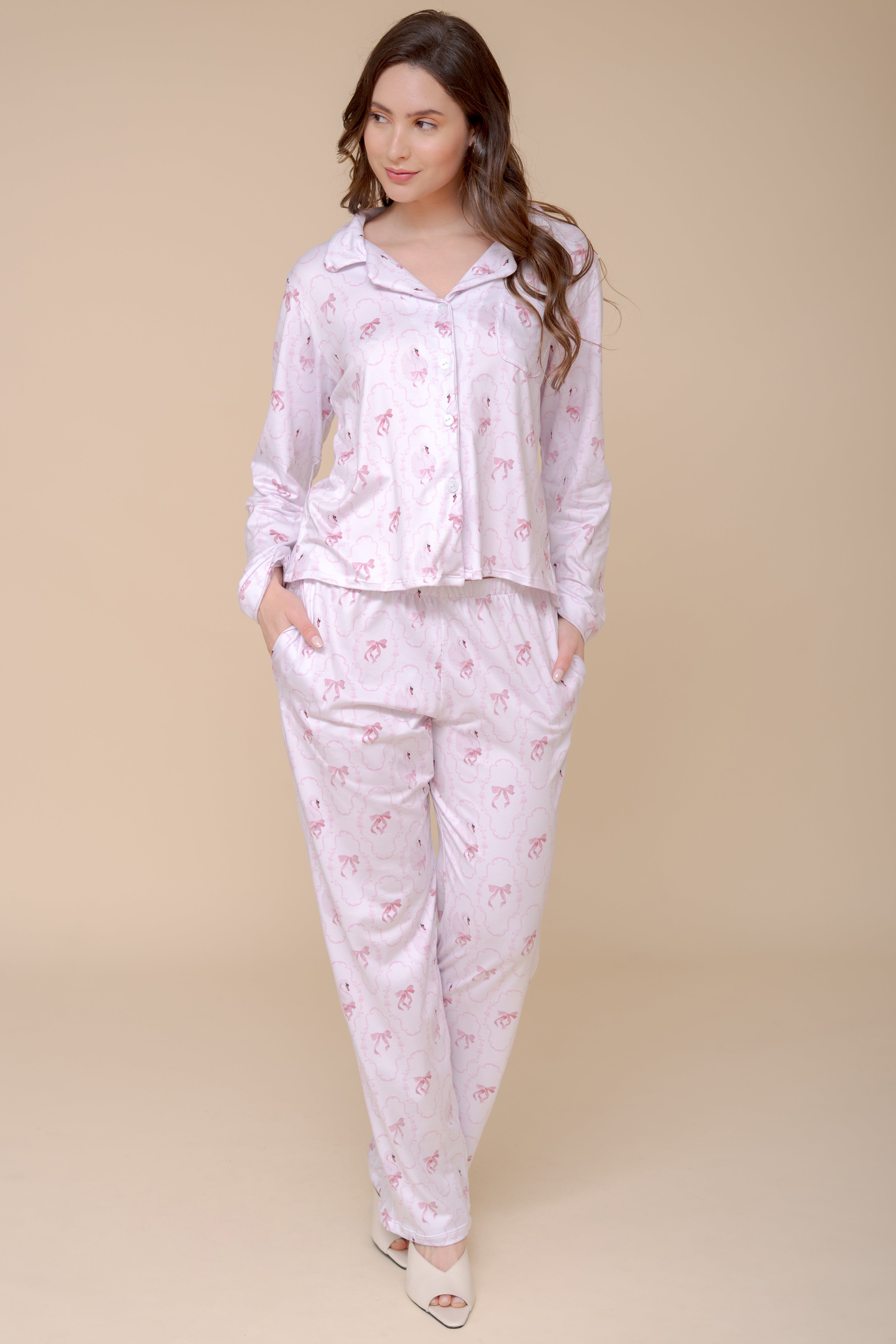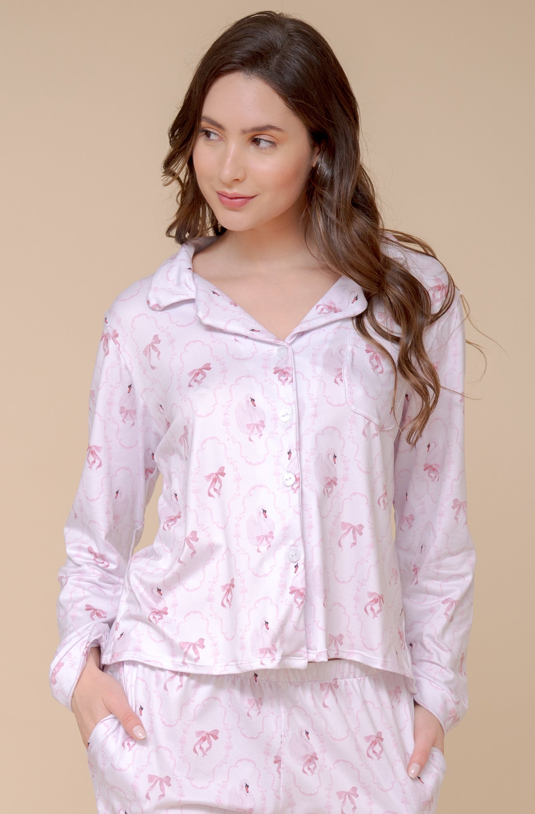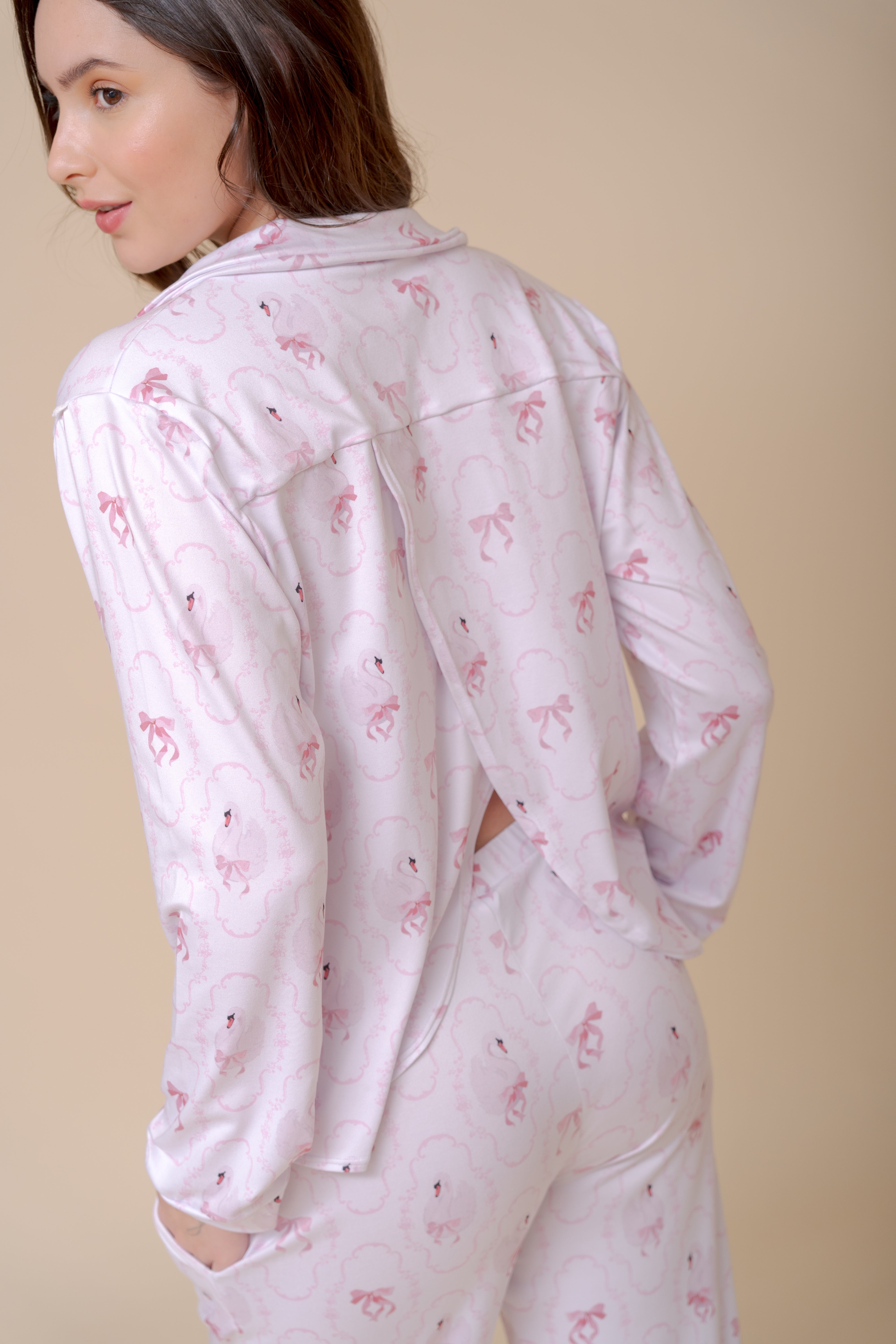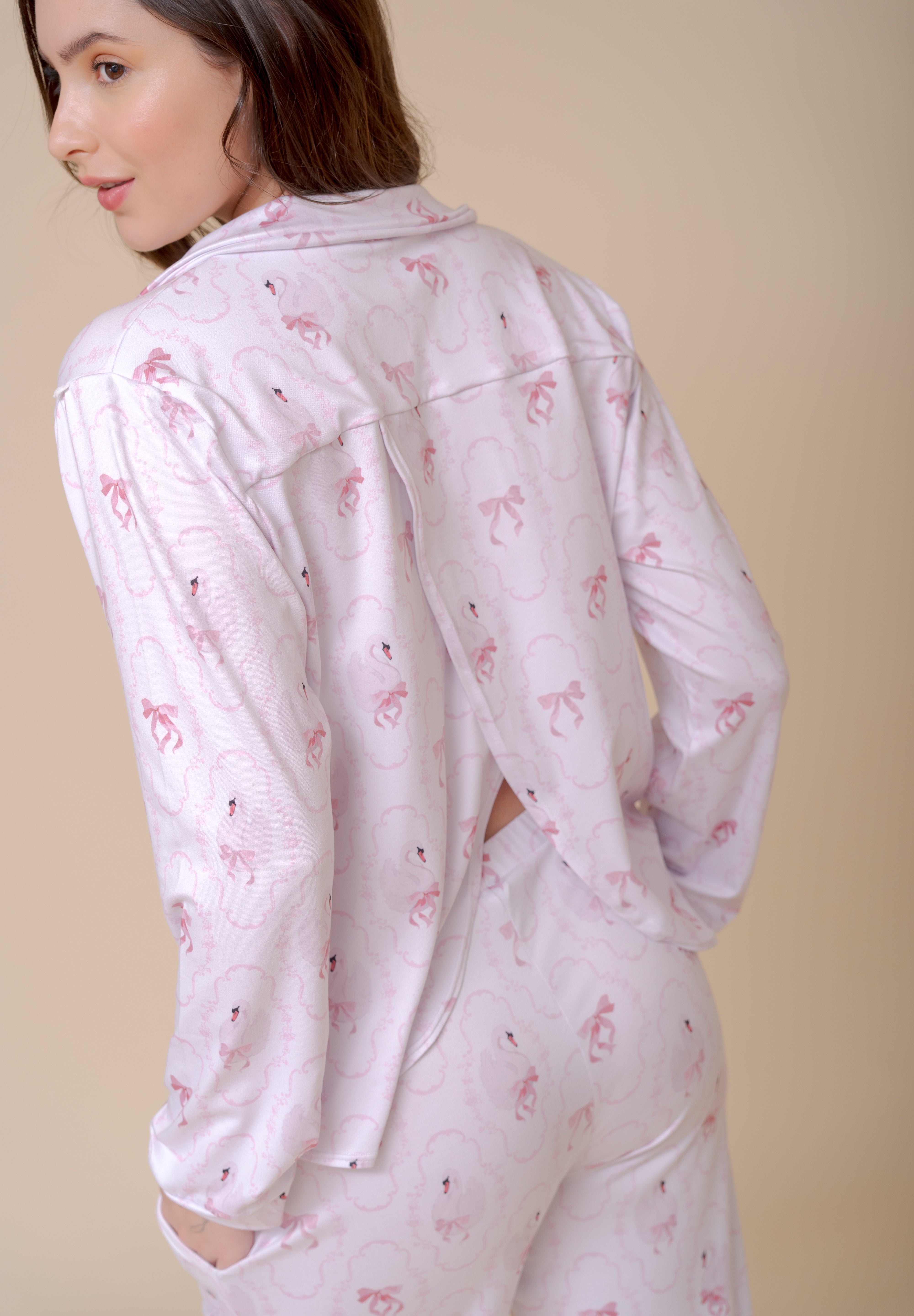 Nuestra Pijanna Ballet Swan celebra la feminidad suave y la calma de los momentos en casa. Confeccionada en tela peach, una base suave y delicada al tacto, se viste de un print inspirado en cisnes y lazos rosados que evocan la estética del ballet clásico y la dulzura de sus detalles.