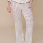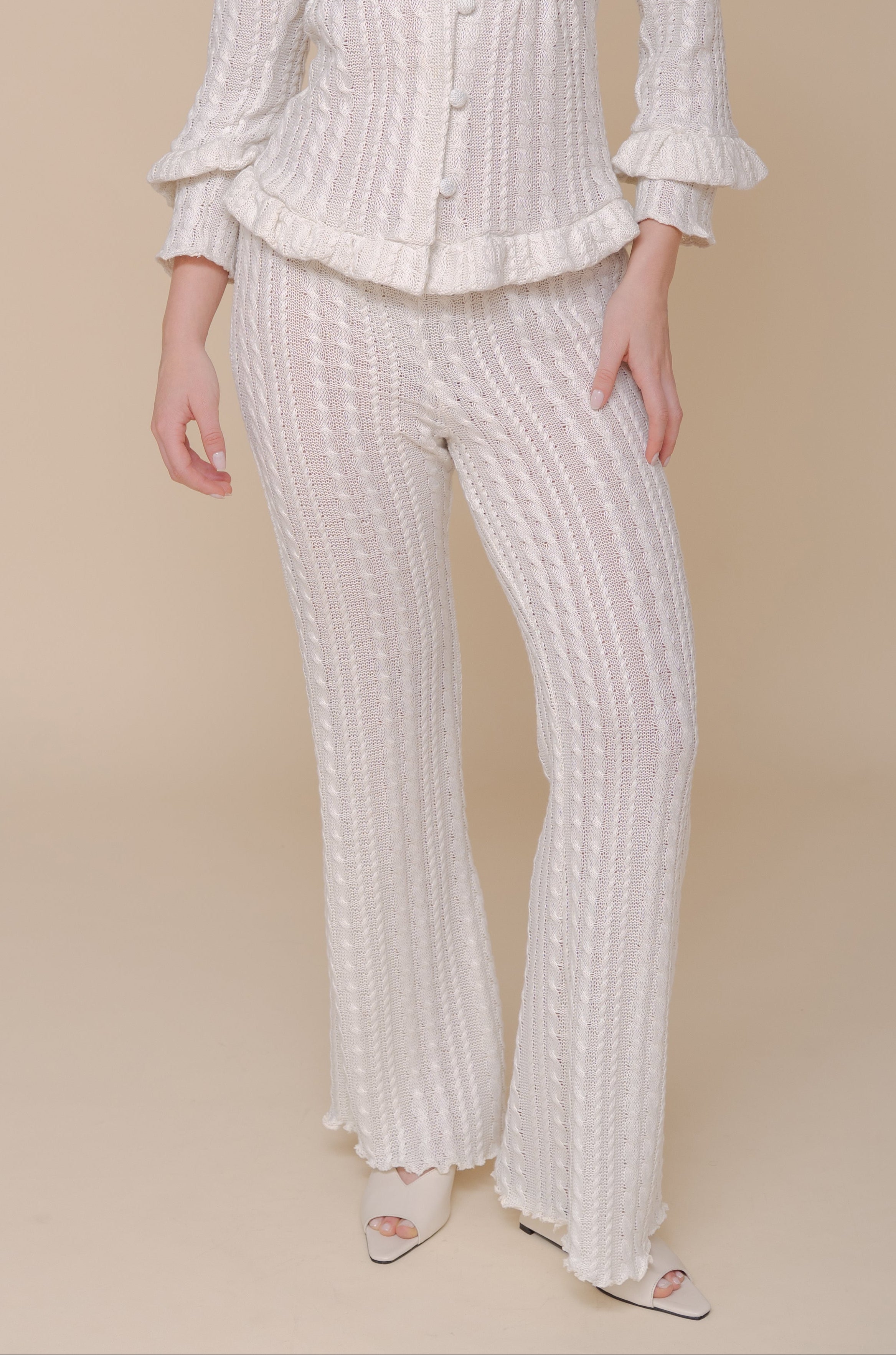 Confeccionados en algodón tejido de textura trenzada, su tono crema y su silueta semi ajustada estilizan la figura sin perder comodidad. La bota levemente acampanada aporta movimiento y un toque femenino que equilibra lo relajado con lo sofisticado.