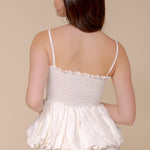 Su silueta ajustada en el busto con caída tipo peplum crea un movimiento ligero y delicado, mientras el escote con encaje y los tirantes finos aportan un aire romántico y sutilmente íntimo. La espalda con panel elástico crea un equilibrio entre romanticismo y comodidad, adaptándose al cuerpo con suavidad natural.